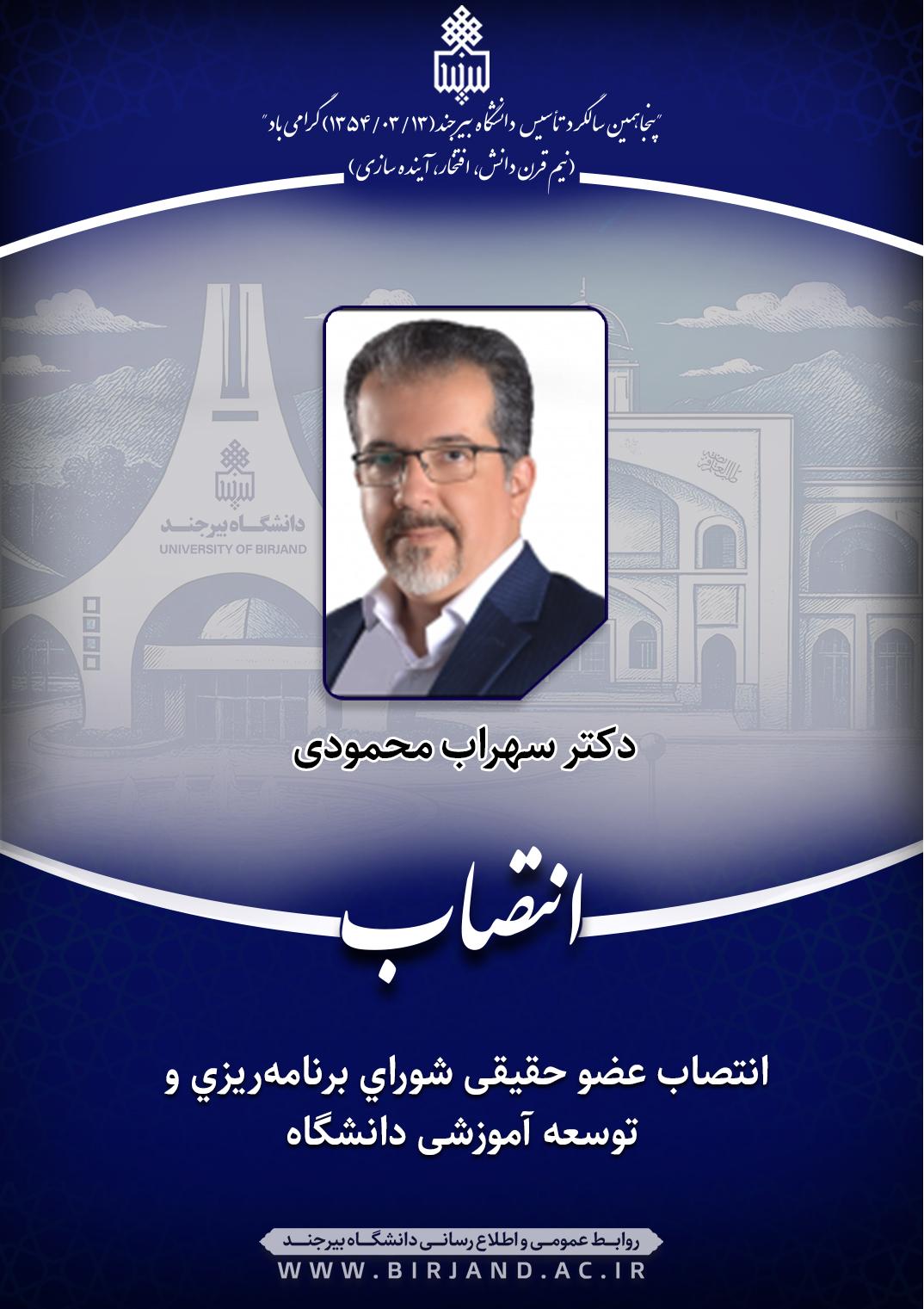 دکتر احمد خامسان، سرپرست دانشگاه بیرجند، براساس ابلاغی، دکتر سهراب محمودی، عضو هیأت علمی گروه آموزشی مهندسی تولید و ژنتیک گیاهی را به سمت عضو حقیقی شورای برنامه‌ریزی و توسعه آموزشی دانشگاه به مدت دو سال منصوب کرد.