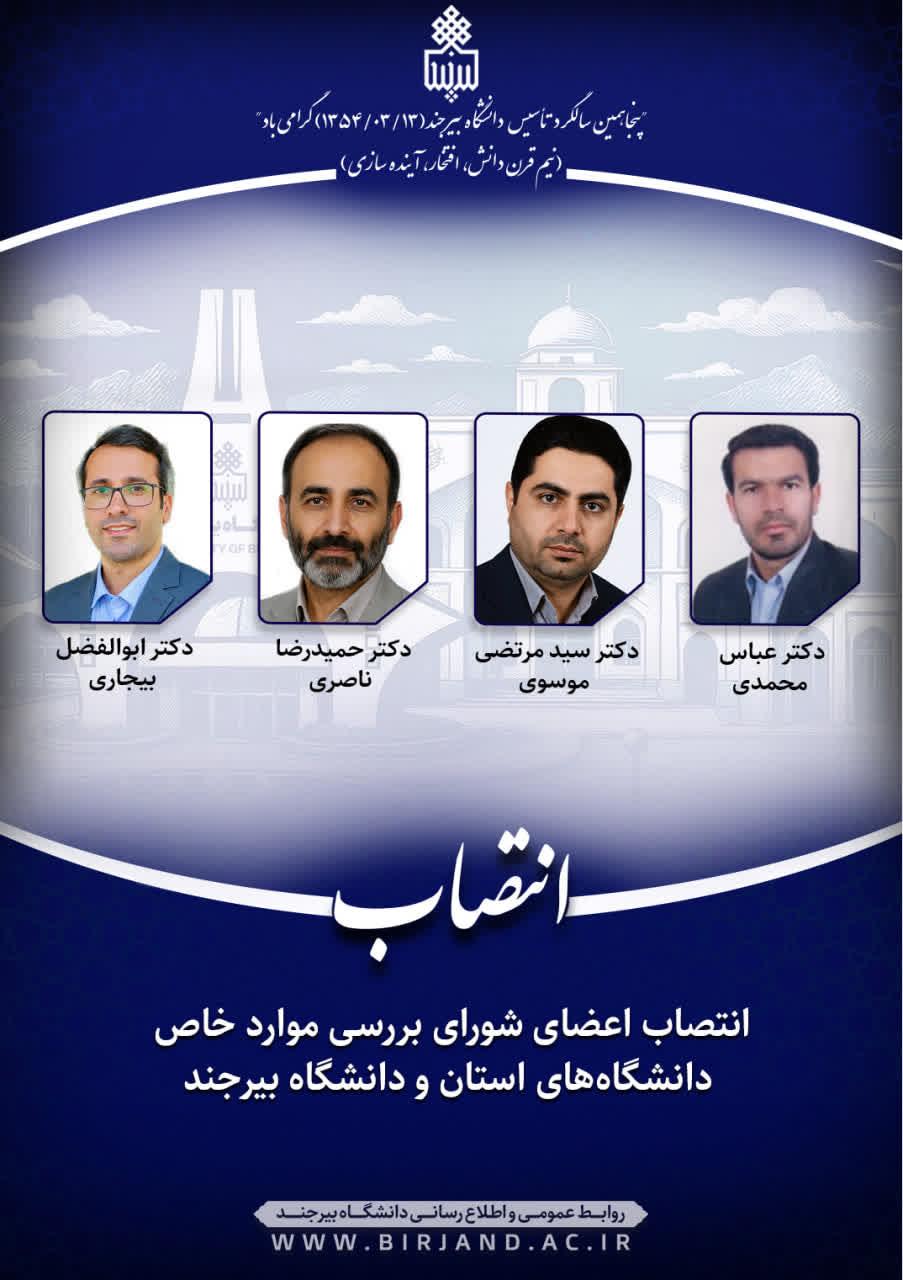 به گزارش روابط عمومی و اطلاع‌رسانی دانشگاه بیرجند، براساس ابلاغ‌های انتصاب صادره از سوی سرپرست دانشگاه، دکتر سیدمرتضی موسوی، به سمت عضو شورای بررسی موارد خاص دانشگاه‌های استان خراسان جنوبی و دکتر عباس محمدی، عضو هیأت علمی گروه آموزشی گیاه‌پزشکی و دکتر ابوالفضل بیجاری، عضو هیأت علمی گروه مهندسی برق ـ الکترونیک به سمت عضو شورای بررسی موارد خـاص دانشگاه بیرجند به مدت دو سال منصوب شدند.