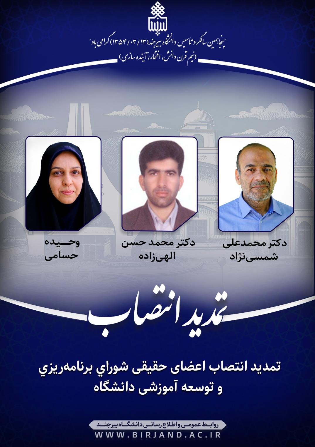 به گزارش روابط عمومی و اطلاع‌رسانی دانشگاه بیرجند، در متن ابلاغ‌های صادره از سوی دکتر خامسان به دکتر محمدعلی شمسی‌نژاد، عضو هیأت علمی گروه آموزشی مهندسی برق ـ قدرت، دکتر محمد حسن الهی‌زاده، عضو هیأت علمی گروه آموزشی تاریخ و وحیده حسامی، عضو هیأت علمی گروه آموزشی فرش، آمده است؛ بنـا به پیشنهـاد معـاون محترم آموزشـی و تحصیلات تکمیلی دانشگاه و نظر بـه مراتب تعهـد، تجـارب و شایستگی‌های علمی جنابعالی، با تمدید انتصاب شـما به عنوان عضو حقیقی شورای برنامه‌ریزی و توسعه آموزشـی دانشگاه به مـدت دو سـال موافقت می‌شود. امیـد است بـا اتکال به خـداونـد سـبحان و بهره‌گیری از مشارکت و همفکری سایر اعضا در راســتای تحقق اهـداف و مأموریت‌های محوله از جمله؛ بازنگری و هـدایت رشــته‌های تحصــیلی، به‌روزرسانی برنامه‌های درســی، و ایجاد نوآوری‌های آموزشـی در دانشگاه موفق و مؤید باشید.