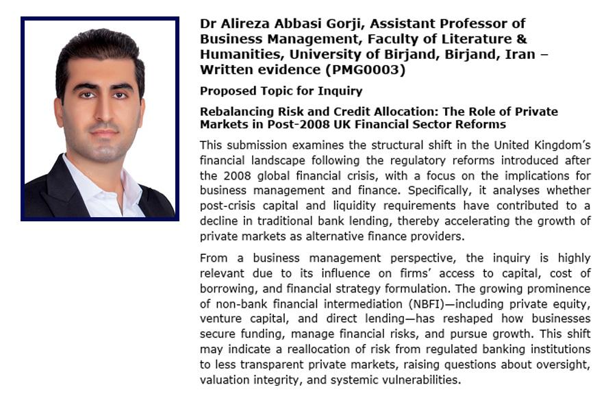 به گزارش روابط عمومی و اطلاعرسانی دانشگاه بیرجند، در پژوهش "متعادلسازی مجدد ریسک و تخصیص اعتبار: نقش بازارهای خصوصی در اصلاحات بخش مالی انگلستان بعد از سال ۲۰۰۸"دکتر عباسی، عضو هیأت علمی دانشگاه بررسی میکند که چگونه الزامات جدید سرمایه و نقدینگی پس از بحران مالی جهانی باعث کاهش وامدهی سنتی بانکها شده و در نتیجه، بازارهای خصوصی مانند سرمایهگذاری جسورانه، سهام خصوصی و تأمین مالی مستقیم رشد چشمگیری یافتهاند. این تحول، شیوههای تأمین مالی شرکتها را دگرگون کرده و ریسک را از بانکهای تحت نظارت به نهادهای کمتر شفاف منتقل کرده است.
