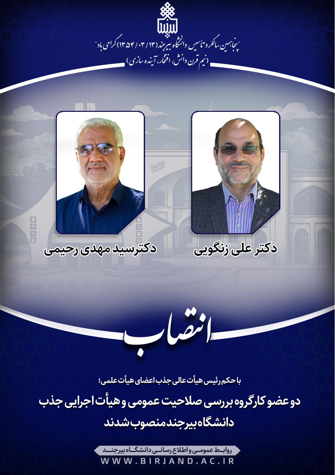 به گزارش روابط عمومی و اطلاع‌رسانی دانشگاه بیرجند، در بخشی از احکام انتصاب دکتر سیدمهدی رحیمی، عضو هیأت علمی گروه آموزشی ادبیات و دکتر علی زنگویی، عضو هیأت علمی گروه آموزشی معارف اسلامی دانشگاه بیرجند، آمده است؛ در اجرای مصوبه جلسه 608 شورای عالی انقلاب فرهنگی و به دنبال بررسی های انجام شده و نظر به سوابق و تجارب ارزشمند آن فرهیخته گرامی در حوزه آموزش عالی و بنا به تصویب جلسه 356 هیأت عالی جذب مورخ 15 مهر 1404، به موجب این حکم  جنابعالی به مدت 4 سال به عنوان عضو کارگروه بررسی صلاحیت عمومی دانشگاه بیرجند منصوب می‌شوید.