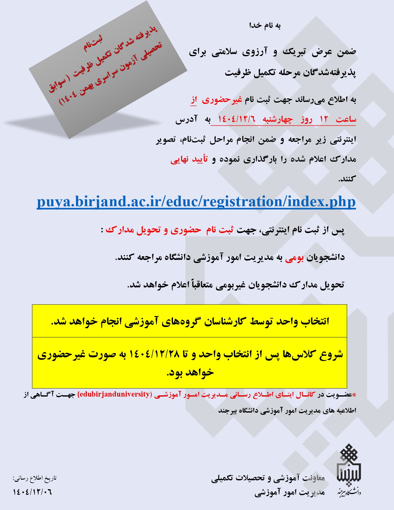 به اطلاع می‌رساند جهت ثبت نام غیرحضوری  از ساعت 12 روز چهارشنبه 6/12/1404 به آدرس اینترنتی زیر مراجعه و ضمن انجام مراحل ثبت­نام، تصویر مدارک اعلام شده را بارگذاری نموده و تأیید نهایی کنند.