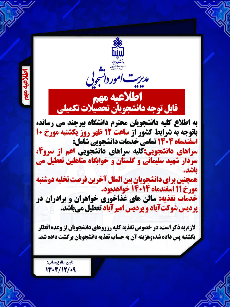 ضمنا به اطلاع کلیه دانشجویان محترم تحصیلات تکمیلی دانشگاه بیرجند میرساند، باتوجه به شرایط کشور از ساعت 12 ظهر روز یکشنبه مورخ 10 اسفندماه 1404 تمامی خدمات دانشجویی شامل